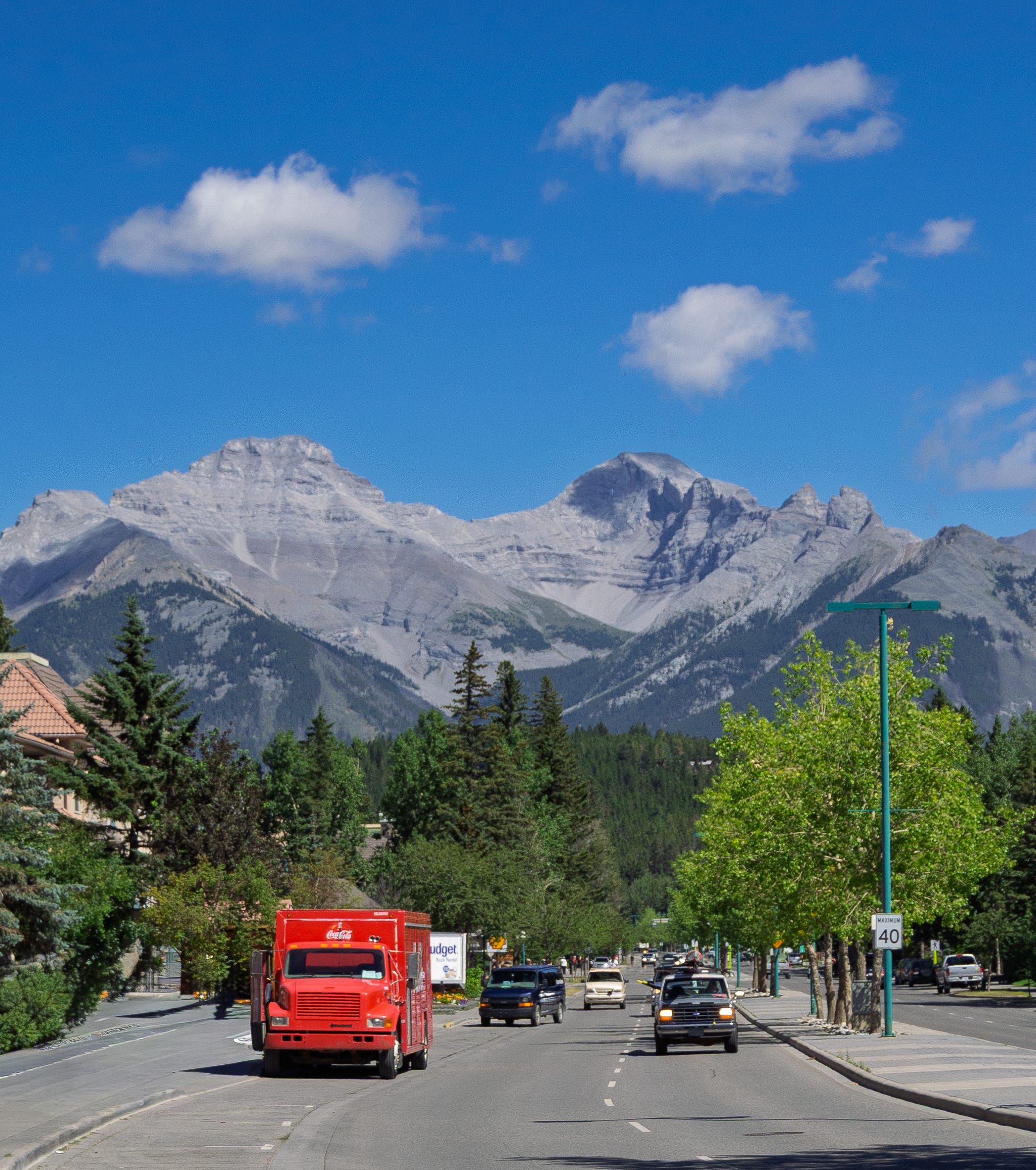 This image captures a bright red Coca-Cola delivery truck driving down a street in Banff, Alberta, with the majestic Rocky Mountains in the background.