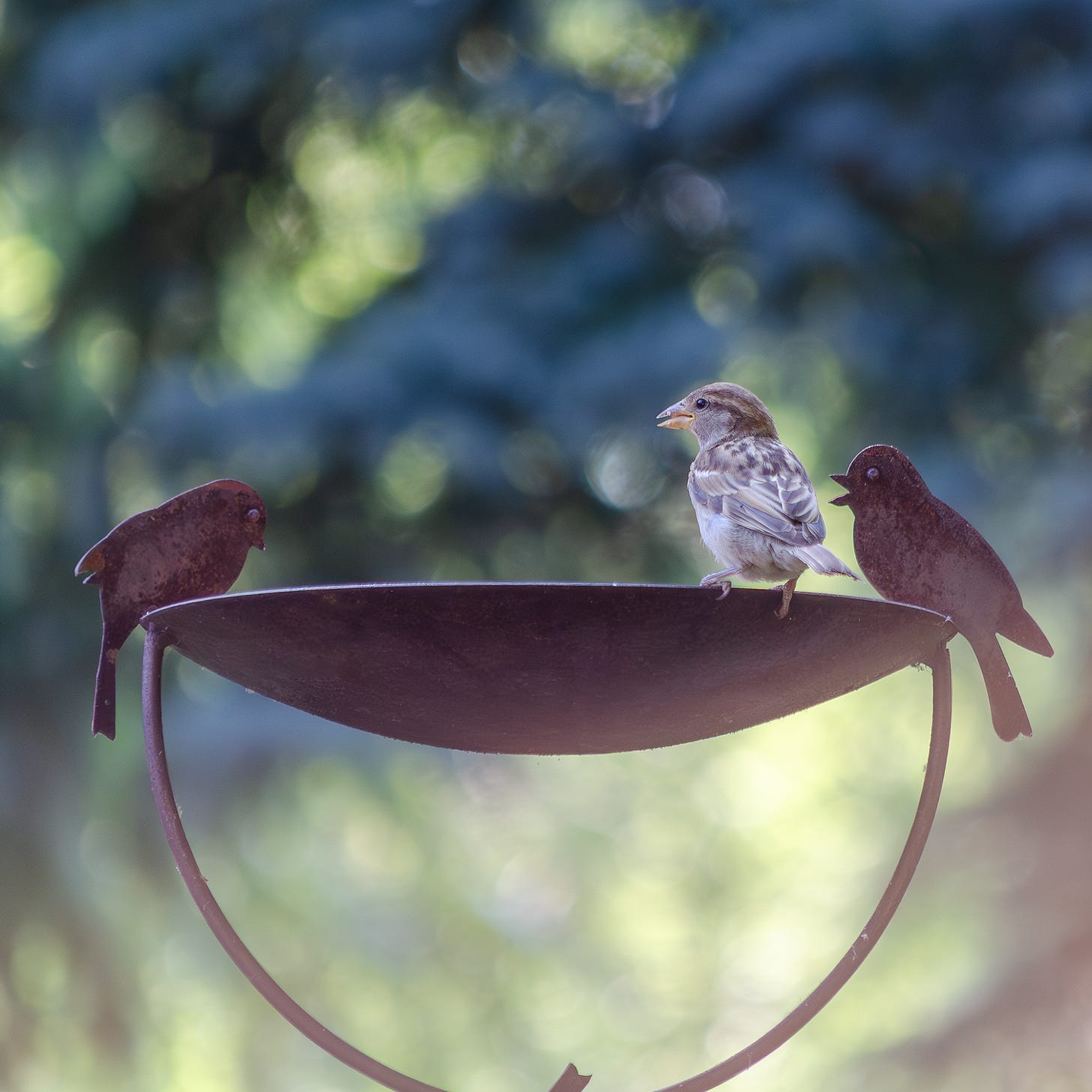I have a great spot on our patio for our bird feeder. Caught this female House Sparrow holding a morning summit with the metal locals. LOL A fun little study in life imitating art—or maybe just a bird looking for a snack.
