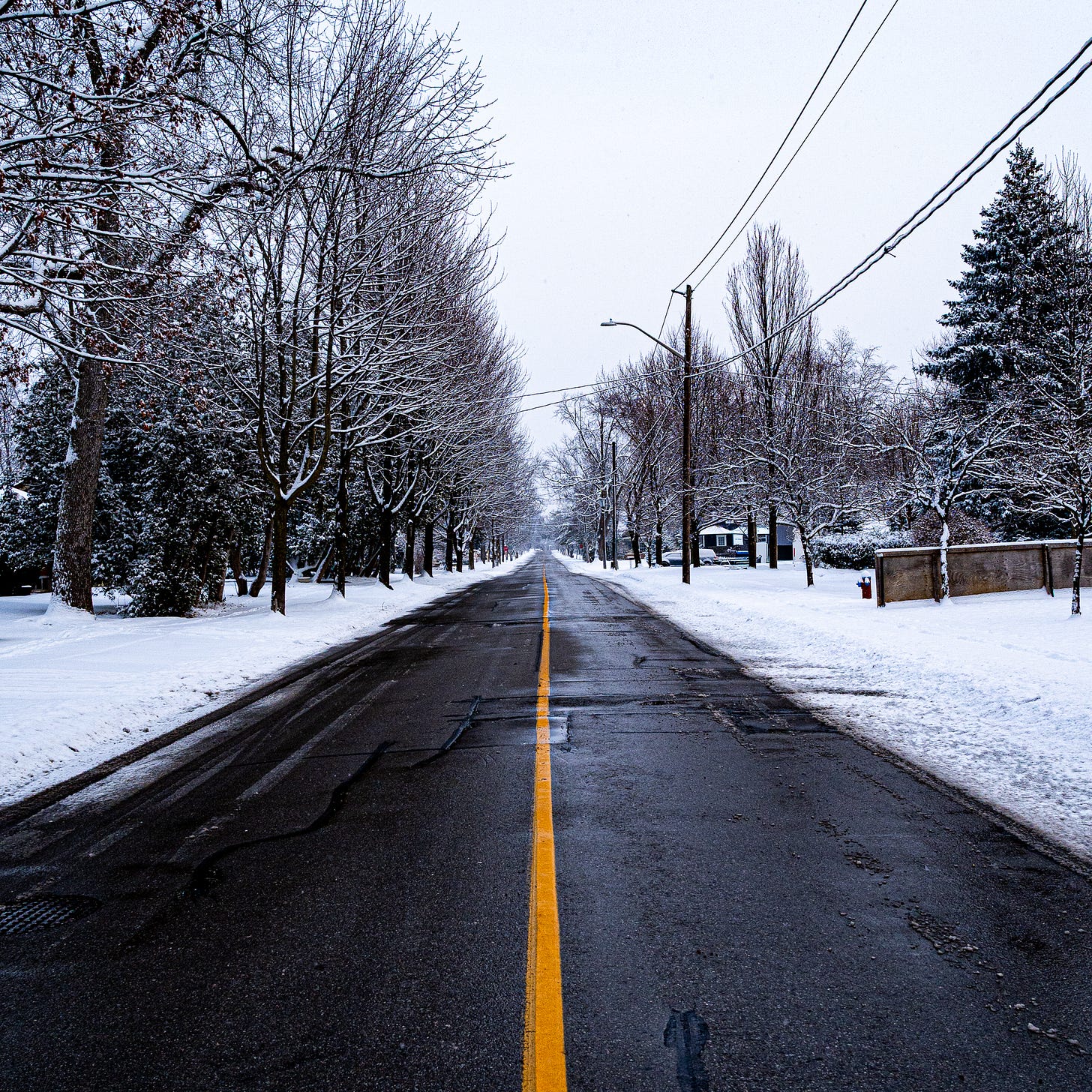 With spring temperatures, the street is often too warm for snow to accumulate, creating an almost black-and-white scene. With my goal this year to learn B&W photography, I thought this would be a perfect subject. However, I kept this as a color picture as I loved the yellow lane divider being the subject of the scene. Always learning something new.