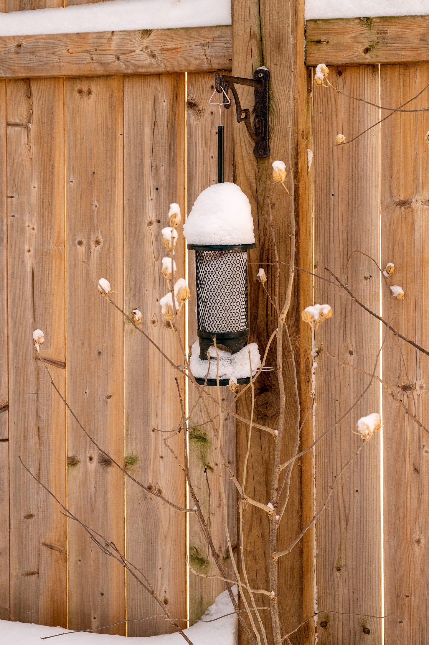 With spring today, I am filling our bird feeder, and I also came across this photo from a couple of weeks ago. Brings me so much joy to see this filled with seed rather than snow. I love the spring colors of the fence and the branches from the Rose of Sharon framing the feeder, all with different hues of brown