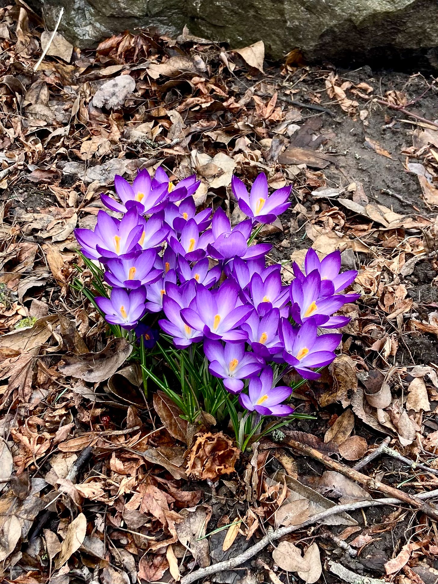 Finally!! Spring has sprung. It feels like this tight cluster of crocuses broke ground overnight, pushing straight through the heavy, monochromatic blanket of last year’s decaying leaves. I love the striking visual contrast here—the delicate, translucent purple petals and bright yellow centers standing in the muted winter debris.