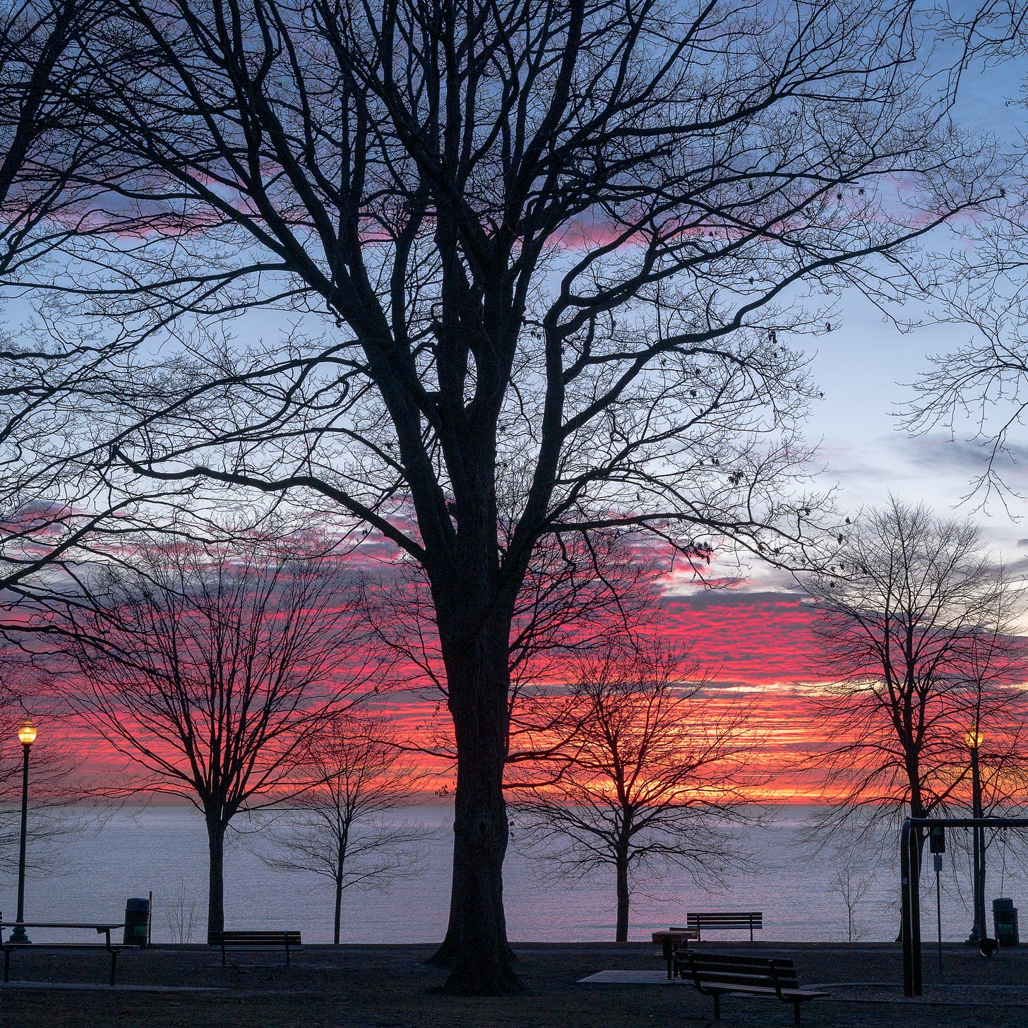 There is a specific magic I find in sunrises over the water. Before the sun clears the horizon, its low-angled light has to travel through the thick morning atmosphere, stripping away the blues and casting pure, fiery red against the bottom of the lake clouds. (ScienceDaily - Jan 19, 2023 I had to look up why. )