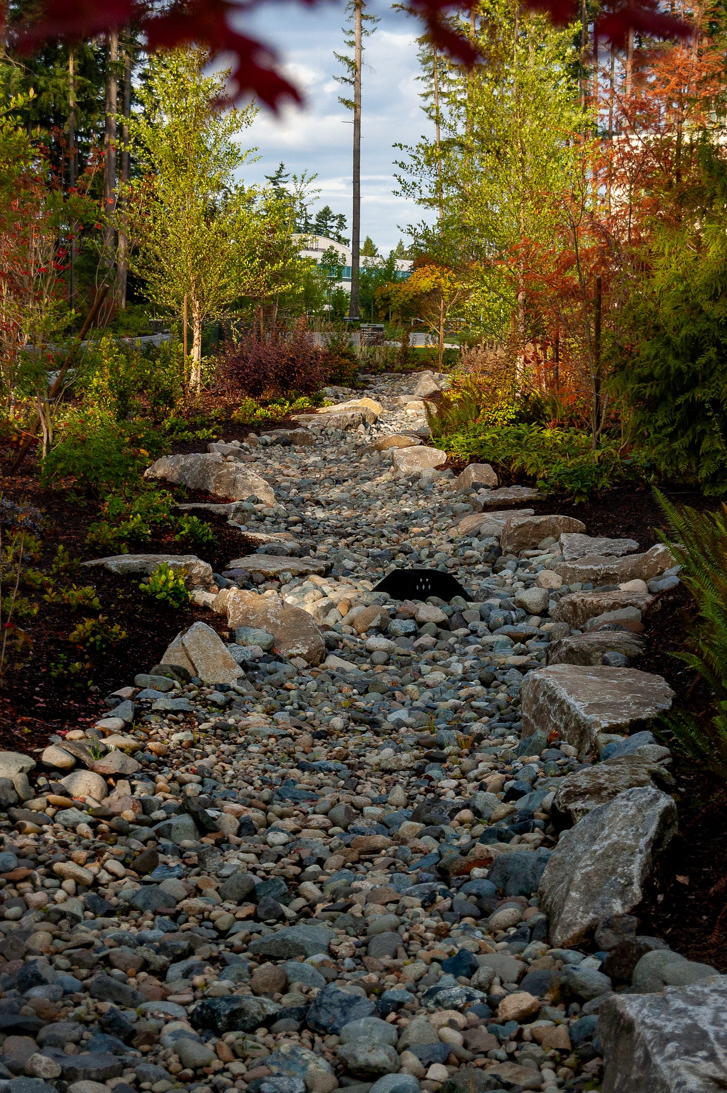 A beautiful example of functional design imitating nature. This winding dry creek bed isn’t just a scenic landscaping choice; it’s a deliberately engineered water-management feature. I love how the heavy, textured river rock creates a strong leading line, drawing the eye past the autumn foliage and deep into the campus.