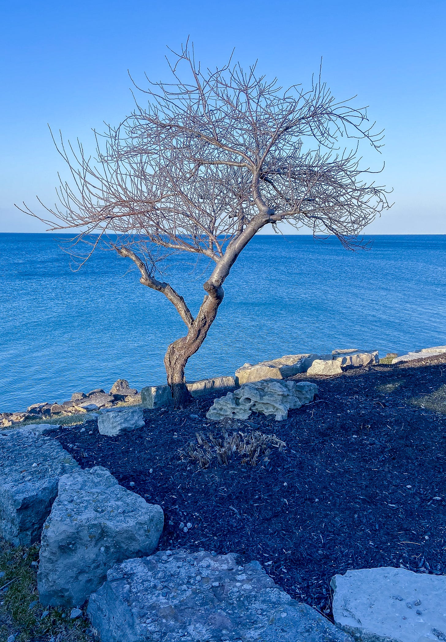 On the shoreline, waiting for spring. Stripped of its foliage, this solitary tree reveals its true, twisting architecture. I love how the stark, chaotic lines of the bare branches stand in sharp contrast against the deep, endless blue of the lake and sky. Grounded by heavy, textured limestone blocks, it’s a beautiful study in resilience—a structural silhouette quietly holding its ground until the warmer weather returns.