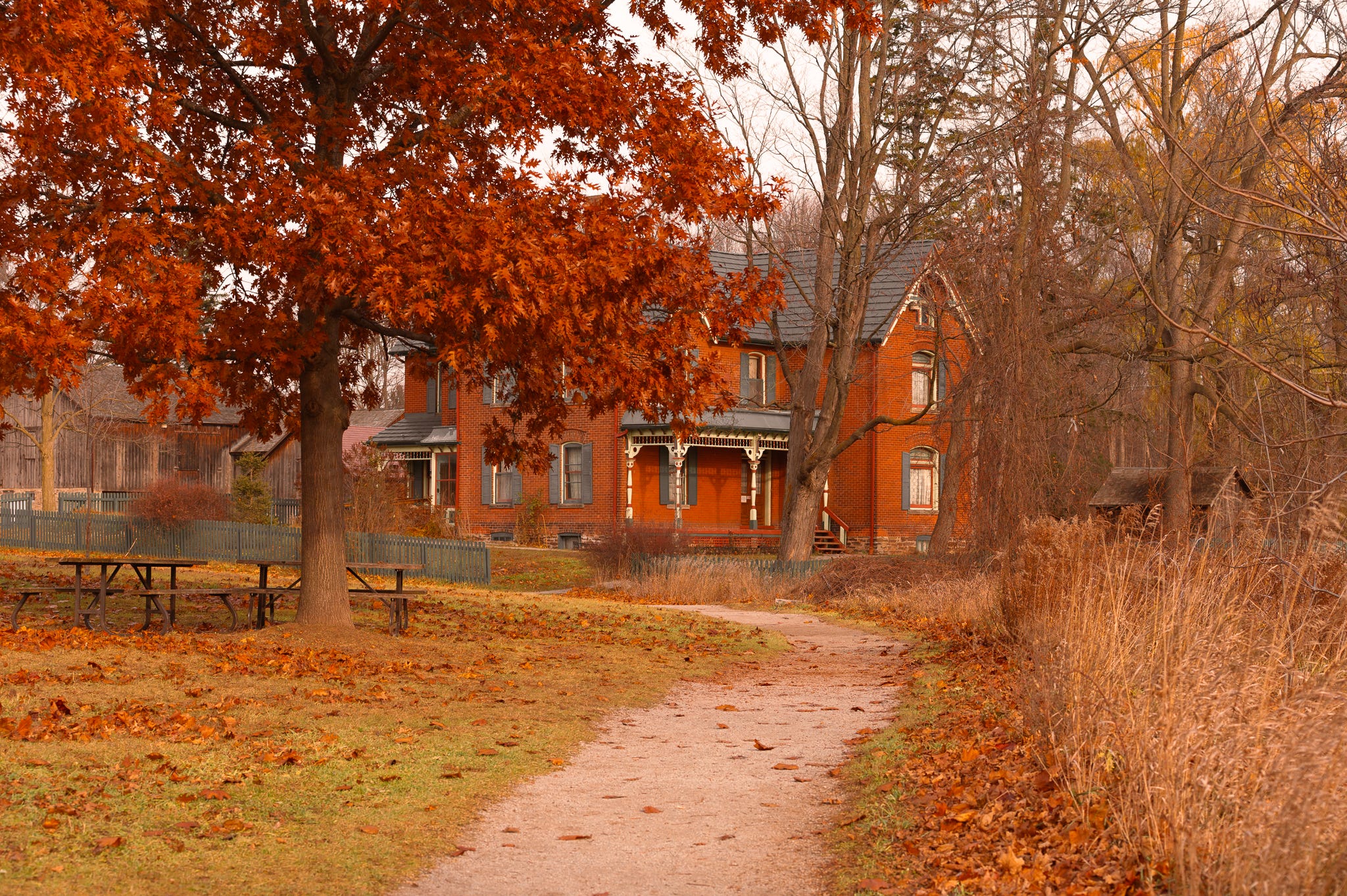 I was taking a fall walk just as the leaves were beginning to fall. This is the main path leading into the old farmhouse and barns. You can imagine the history of the Spruce Lane Farmhouse in Bronte Creek Provincial Park since 1899, when Henry and Margaret Breckon built it; it is a restored, haunted Victorian-era home representing turn-of-the-century rural life.