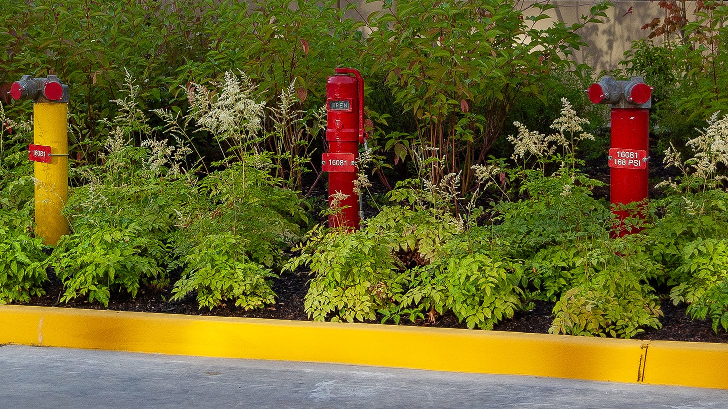 That being said, I liked drawing attention to the bright curb that anchors the bottom of the frame and the heavy metal standpipes hidden among the soft, feathery flowers. New enough development not to be too hidden.